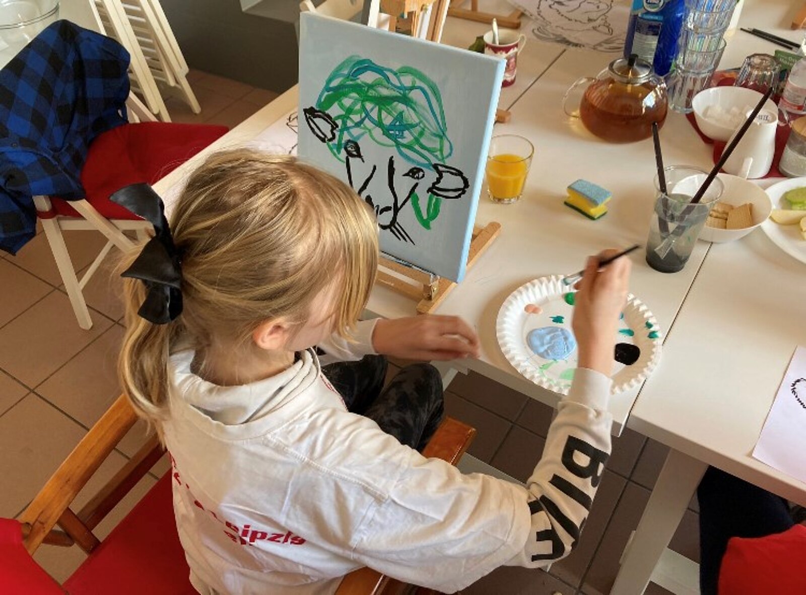 Entstanden sind wunderbar farbenprächtige und individuell verschiedene Tiergesichter - toll! Im Anschluss gab es natürlich noch ein Mittagessen für die Kids, gewünscht waren Hot Dog, und die Bilder konnten alle natürlich mit nach Hause nehmen.