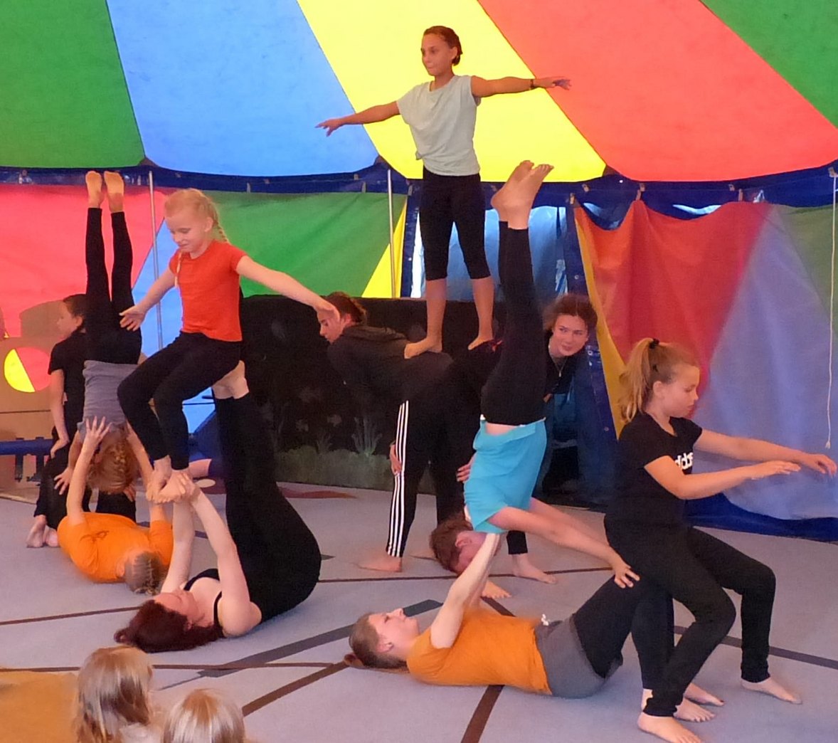 An allen weiteren Vor- und Nachmittagen wurde in festen Gruppen geübt, was das Zeug hielt: Balance halten war auf dem Drahtseil, dem Rola Bola und auf der Laufkugel gefragt; auf Körperspannung und Konzentration kam es bei der Akrobatik an. Am Diabolo, dem Flowerstick und bei der Jonglage war gute Auge-Hand-Koordination gefragt. Alle Kinder lernten schnell, arbeiteten gut mit und lieferten kreative Ideen für die Gestaltung der einzelnen Nummern.Bereits Mittwoch waren die Nummern fertig und mussten am Donnerstag nur noch gefestigt werden.