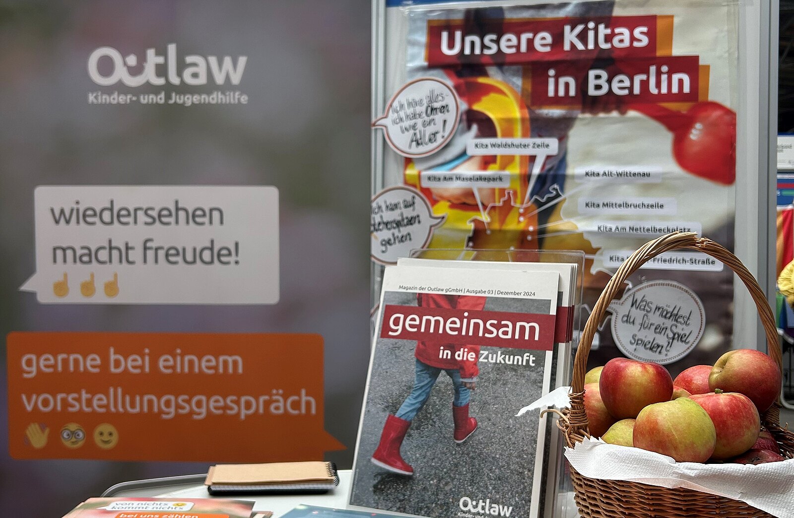 Diese Gelegenheit nutzten wir, um die vielfältige Arbeit unserer Berliner Kitas vorzustellen und mit Interessierten ins Gespräch zu kommen. Mit dabei waren Silvia Seibt, pädagogische Fachkraft unserer Kita Alt-Wittenau und Devrim Bozkurt, Auszubildender unserer Kita Am Maselakepark. Silvia Seibt berichtete von ihren Erfahrungen zum Thema Quereinstieg und gab wertvolle Tipps an Interessierte weiter, während Devrim Bozkurt spannende Einblicke in seine Ausbildung und den pädagogischen Alltag teilte. Klaudia Pacon, verantwortlich für das Personalmarketing und Recruiting in Berlin, koordinierte den Messeauftritt und stand für Fragen zu Einstiegsmöglichkeiten bei Outlaw zur Verfügung.