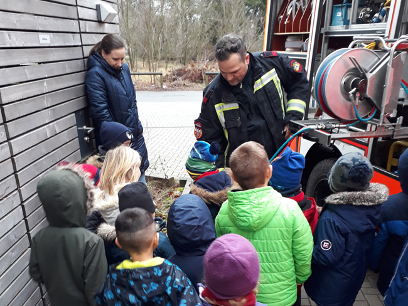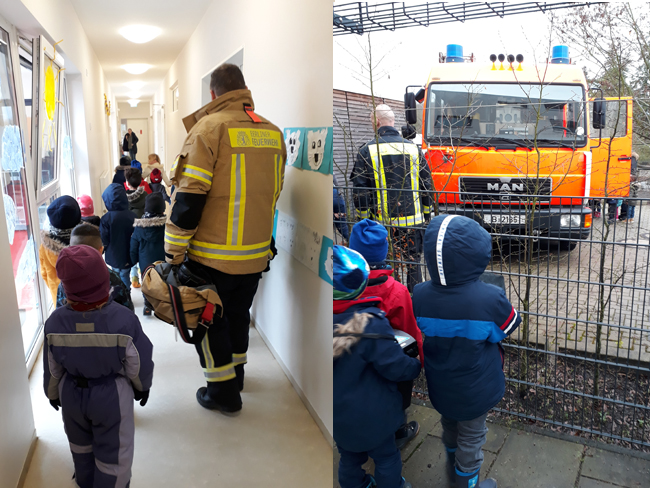 Beim Besuch konnten sie nun in den anderthalb Stunden "einen richtigen Feuerwehrmann" sprechen, sich in ein Fahrzeug setzen und es ganz nah erkunden. Sie durften die Arbeitskleidung und alle Geräte wie Säge und Schlauch anschauen, anfassen und sogar das Blaulicht betätigen. Die Gruppe lernte, dass die Arbeitskleidung von Feuerwehrleuten wie Helm, Atemschutzmaske und Jacke sehr wichtig und unerlässlich sind bei den Einsätzen. Die mitgebrachten Helme probierten sie vergnügt an und ein Kind formulierte enrsthaft: "Den Helm braucht man damit der Kopf nicht brennt!" Beim Helm staunten sie außerdem über die Besonderheit, wie stark und hell er im Dunklen leuchten kann.
