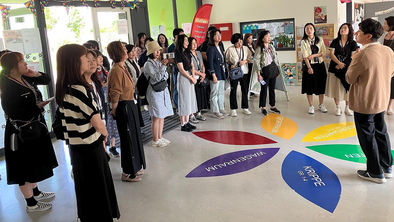 Am 17. Juni 2025 besuchte eine Delegation von 36 Leitungskräften südkoreanischer Kitas gemeinsam mit ihrem Dolmetscher und Initiator Jung Rong Park die Outlaw-Kita Hildegardstraße in Leipzig. Der Besuch fand im Rahmen eines staatlich geförderten Fortbildungsprogramms des südkoreanischen Bildungsministeriums statt, das in Zusammenarbeit mit der Seoul National University of Education organisiert wurde. Ziel ist es, durch internationale Besuche von Bildungseinrichtungen neue fachliche und kulturelle Perspektiven auf die frühkindliche Bildung zu gewinnen.
