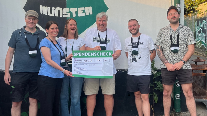 Am 13. Juni 2023 fand eine Spendenübergabe der ganz besonderen Art statt: Drei Preußenfans haben in der Aufstiegssaison Getränkehalter fürs Stadion in Schwarz-Weiß-Grün gehäkelt und „für einen guten Zweck“ an Stadionbesucher:innen verkauft. Bereits früh war das FANport-Team über diese karitative Faninitiative informiert worden. Dass dabei die stattliche Summe von 848 Euro zusammenkam, damit hatte zuvor aber niemand gerechnet.