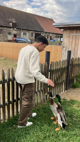 Auf dem Hof bekamen die Jugendlichen tägliche Aufgaben zugeteilt, welche sie zügig eigenverantwortlich in die Hand genommen haben. Dazu gehörten das morgendliche Füttern und Ausmisten aller Hoftiere, darunter Kaninchen, Meerschweinchen, Hühner, Enten, Ziegen, Schafe, Schweine, Esel und Ponys, und das abendliche in den Stall sperren. Zudem fielen rund um den Hof einige Aufgaben an, bei welchen die Jugendlichen Unterstützung leisten konnten. Gemeinsam wurden Terassensteine ausgehoben und Schutt auf den Container geladen.
