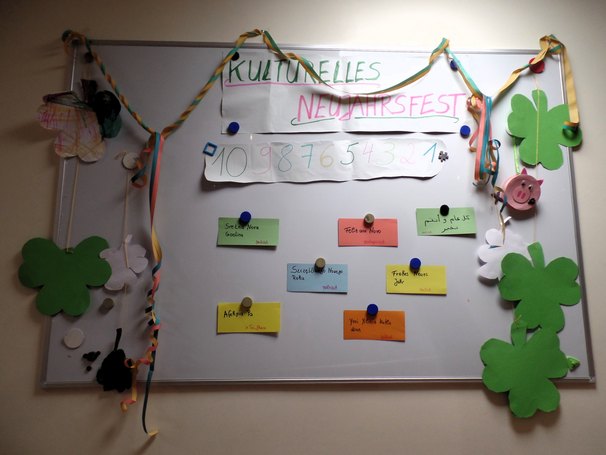 Laut dem gregorianischen Kalender wird in westlichen Kulturen das Neujahr vom 31. Dezember auf den 1. Januar gefeiert. In China und in einigen andere Ländern wird das Neujahr jedoch später begrüßt. Spielerisch und durch Gespräche bereitete das Team die Kinder auf ihr Fest vor. In Kreativ-Angeboten setzten sich die Mädchen und Jungen zum Beispiel mit den unterschiedlichen Flaggen auseinander und stellten einige ihrer Wahl her. Sie gestalteten Glückssymbole wie Hufeisen und Kleeblätter und malten mittels Pustetechnik bunte Silvester-Feuerwerksbilder. Die Eltern unterstützten bei der Sprachenvielfalt und notierten in ihrer Landessprache die allgemeinen Neujahrsgrüße, die Teil der Dekoration wurden.