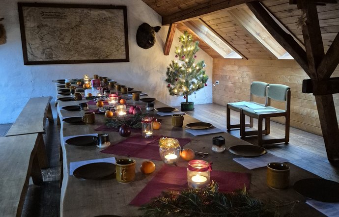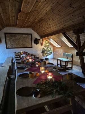 Bei der Ankunft loderte bereits das Feuer und in der Forsthütte war ebenso für einladende Gemütlichkeit gesorgt. An der langen, mit allerlei Leckereien bestückten Tafel kamen zunächst alle Großen und Kleinen zusammen, um gemeinsam Weihnachtslieder anzustimmen. Hierbei waren nicht nur Stimmen gefragt, denn Bettina Rohn, die uns auf dem Akkordeon begleitete, sorgte darüber hinaus für eine Auswahl an Orff-Instrumenten, die genutzt und ausprobiert werden durften. So entstand zwischen Kaffee, Kakao, Stollen und Plätzchen ein ganz besonders stimmungsvolles und im wahrsten Sinne des Wortes „handgemachtes Weihnachtskonzert“, in dem neben Klassikern auch einzelne Liederwünsche zum Besten gegeben wurden.