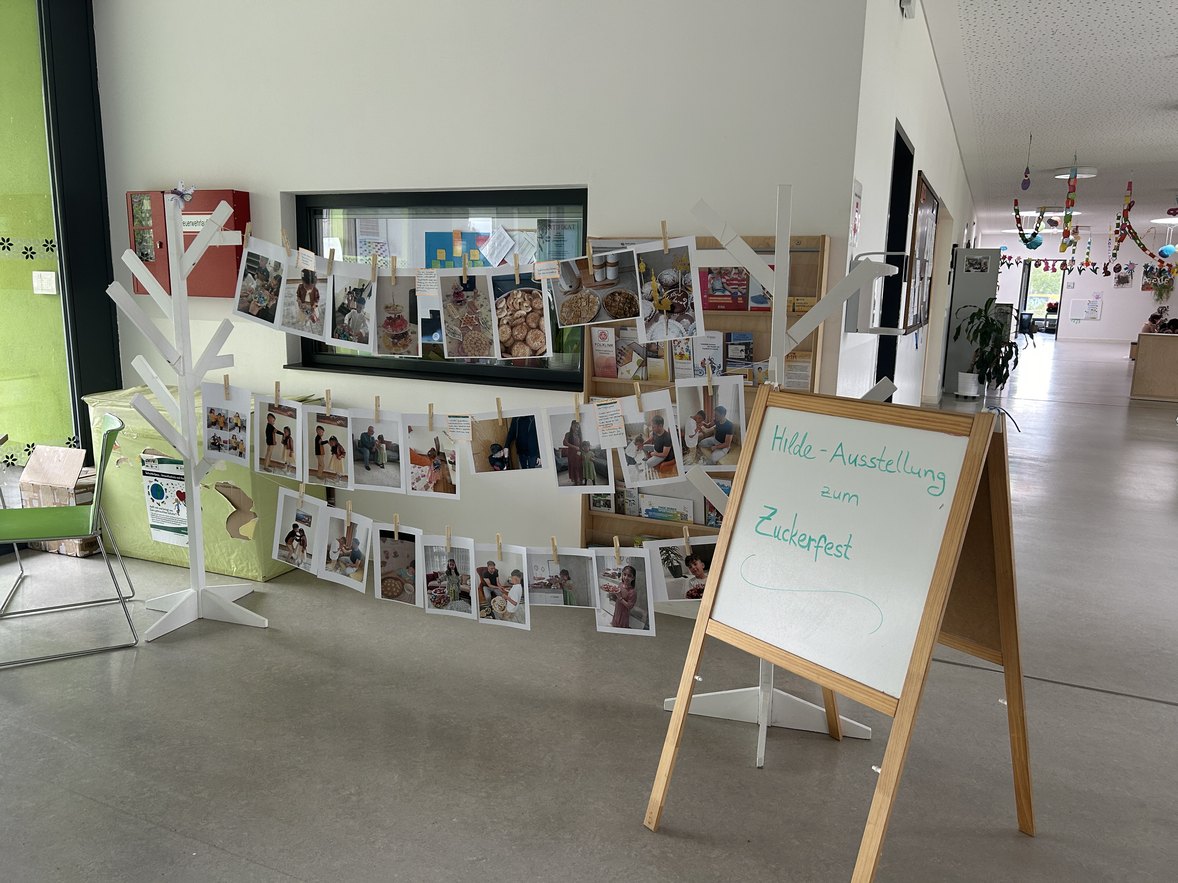 Der Fastenmonat Ramadan endet mit dem Zuckerfest – zum Abschluss des Ramadan-Projektes hing deshalb in der Kita eine Foto-Ausstellung zum Zuckerfest aus: Hier haben die Kinder, die zuhause das Zuckerfest mit ihren Familien gefeiert haben, ihre Eindrücke der Feiern auf Fotos festgehalten und in der Ausstellung ausgehangen.