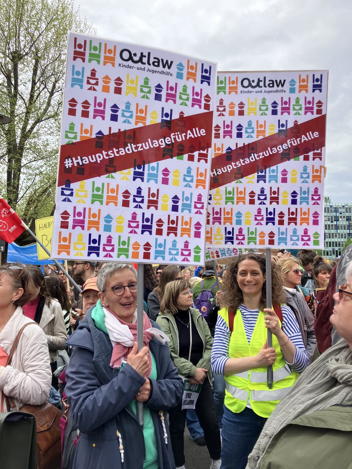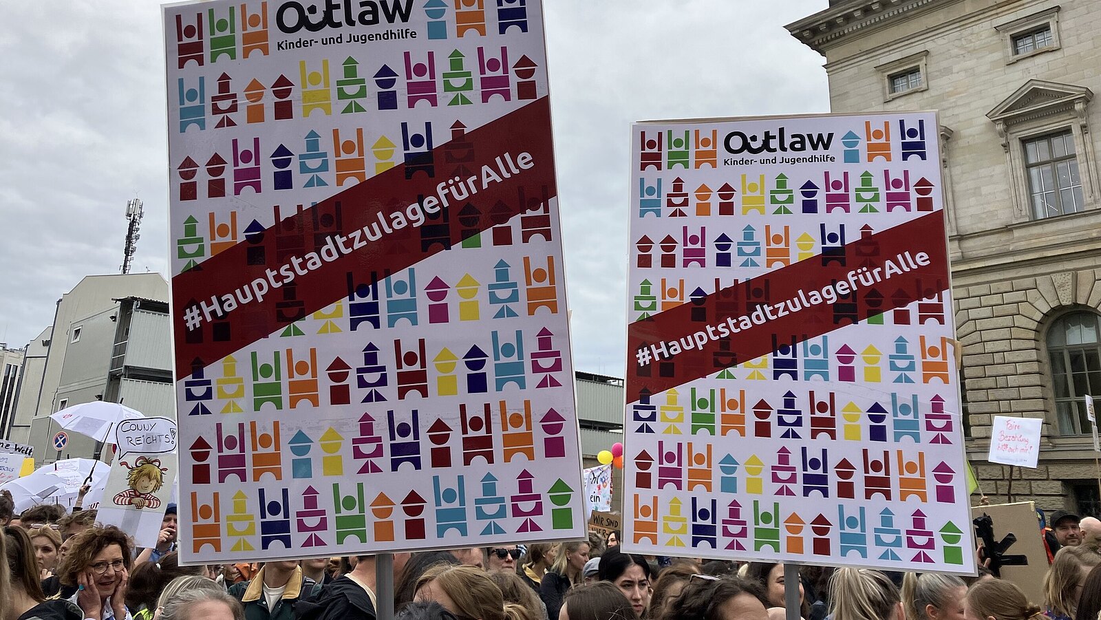 Zum Hintergrund: Seit 2020 zahlt der Berliner Senat den Beschäftigten der Eigenbetriebe eine Zulage von 150 Euro. Im Dezember 2023 wurde die Zulage auch freien Trägern zugesagt, jedoch im Februar 2024 zurückgenommen. Der Ärger darüber wurde durch Ausrufe und Plakate deutlich: "Versprochen ist versprochen!" und "Ist unsere Arbeit weniger wert?" war auf der Demo vermehrt zu hören und zu lesen. Auch in Zukunft wird sich Outlaw für einen fairen Umgang mit der Hauptstadtzulage einsetzen.