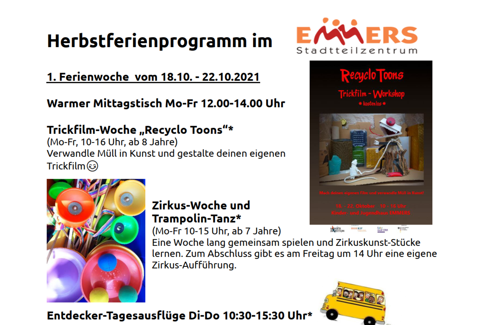 Unser Herbstferien-Programm 2021 beginnt: Auf unserer Website findet ihr alle Infos zu den geplanten Projekten und Anmeldungen. Los gehts in Woche 1 mit dem Trickfilm-Projekt "Recyclo-Toons". Wir verwandeln Müll in Kunst und gestalten unseren eigenen Trickfilm. Außerdem findet die Zirkus-Woche und Trampolin-Tanz statt. Oben drauf planen wir Entdecker*innen-Ausflüge.