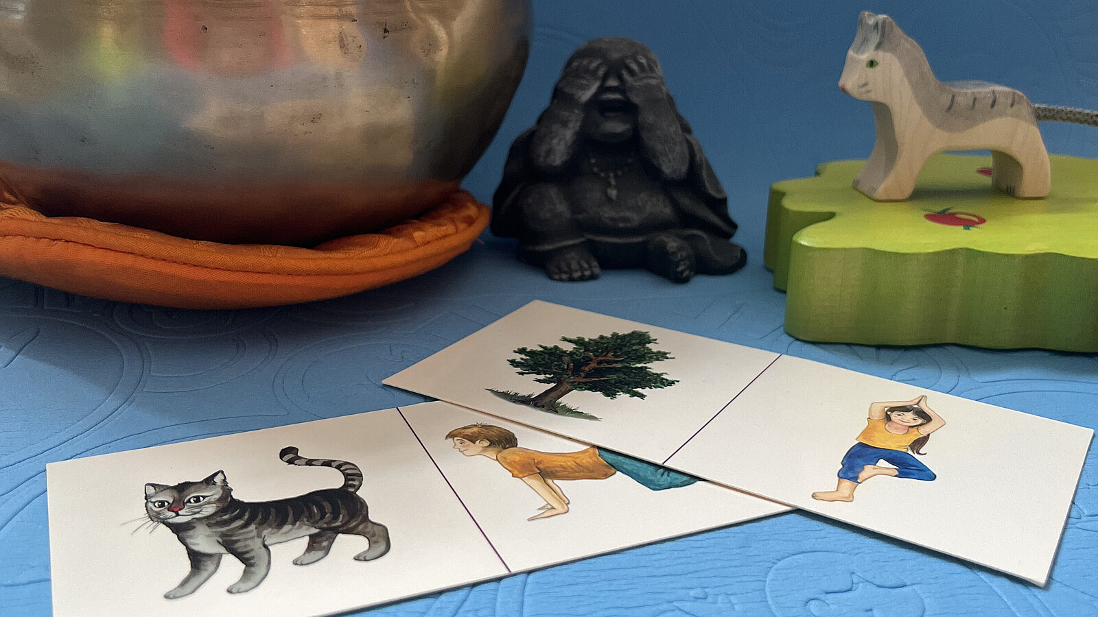 Ob der herabschauende Hund, der Baum oder die Schildkröte – alles kein Problem für die Kids der Kita Rehefelder Straße in Dresden. Spielerisch und mithilfe von Holzfiguren, Karten, Klangschale und Duftsteinen tauchen die Kinder in fantasievolle Yoga-Geschichten ab. Dabei lassen die pädagogischen Fachkräfte aktuelle Themen der Kinder sowie Ideen von yogabegeisterten Praktikant:innen einfließen. Im Mittelpunkt stehen immer die Bewegungsfreude und der achtsame Umgang mit sich und seinem Körper.