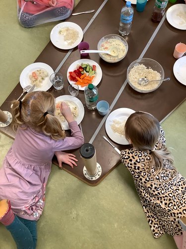 Auch die Mahlzeit wurde zu einem besonderen Highlight des Tages. Der Tisch war kurzerhand falschherum aufgestellt und die Kinder aßen im Liegen, ganz im Sinne eines närrischen Karnevalstages. In dieser ausgelassenen Atmosphäre genossen Kinder und Fachkräfte das fröhliche und farbenfrohe Beisammensein.