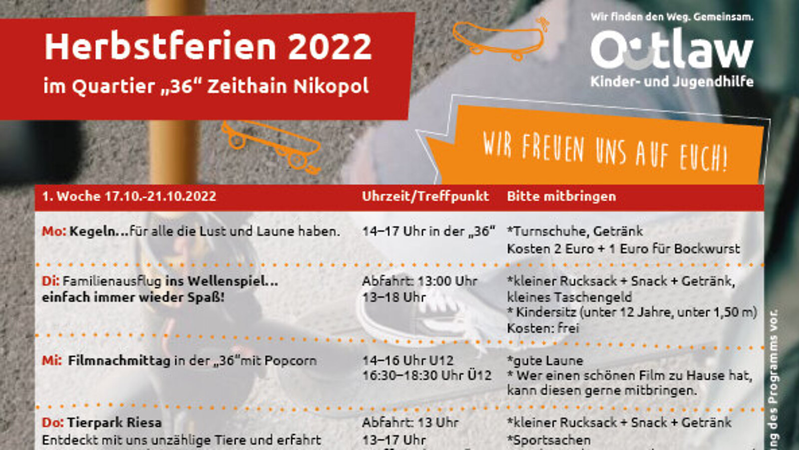 Zwei Wochen Herbstferien und unser Programm steht: Das Team der "36" im Quartier in der Nikopoler Straße in Zeithain freut sich auf euch und hat viele Angebote vorbereitet. Darunter Familienausflüge, Kegeln, Filme schauen, kochen und Kürbisse schnitzen. Hier ist bestimmt für alle etwas dabei.