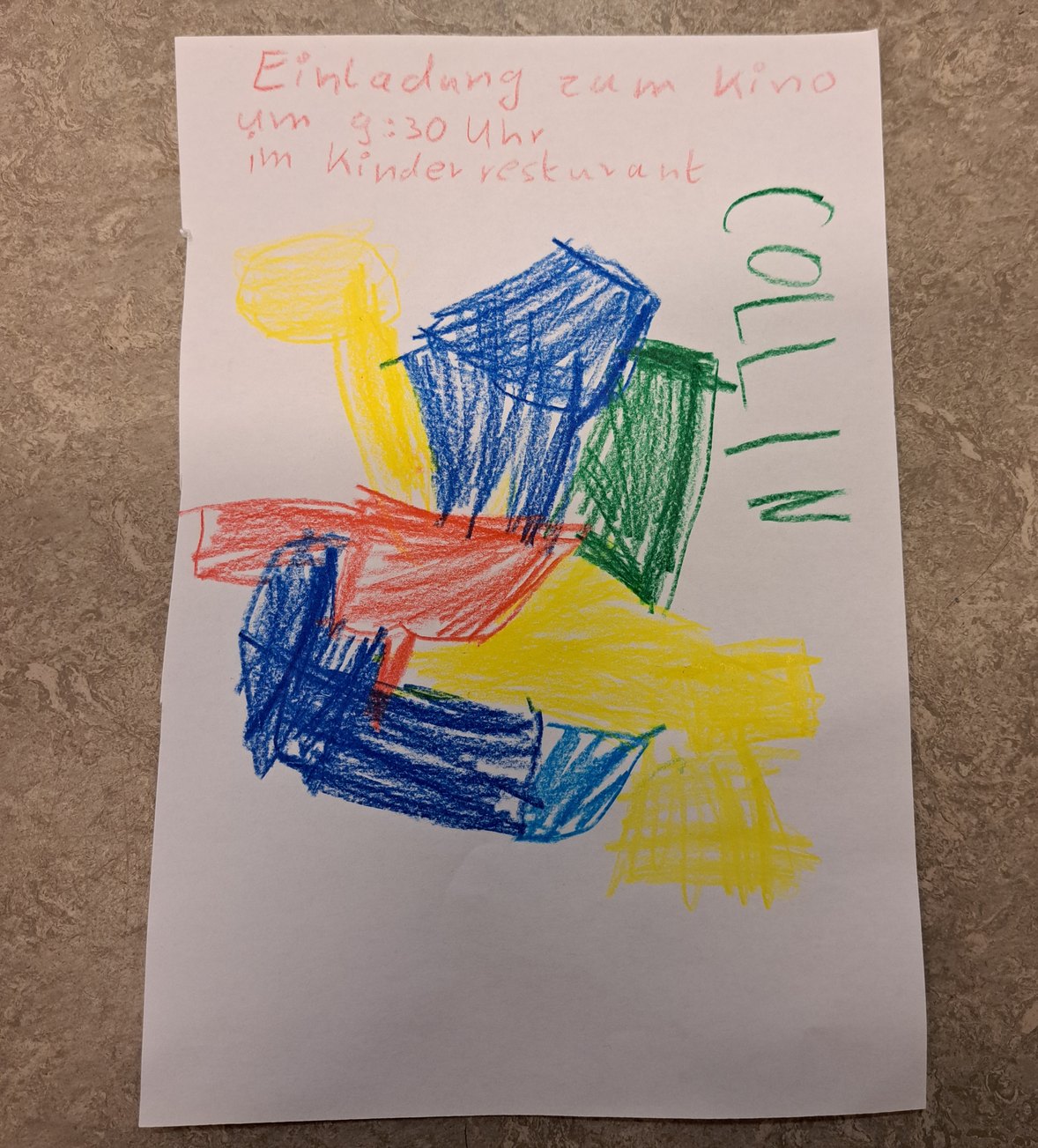 Am letzten Tag vor der Weihnachtsschließzeit gab es in der Kita Kantstraße zum Abschluss des Jahres einen Kinotag. Vorbereitet wurde dieser von der Vorschulgruppe "Wackelzähne" und ihrer Erzieherin Nicole. Und damit auch die Kinder der Sonnenkäfer- und Schmetterlingsgruppe dabei sein konnten, gestalteten die Vorschüler:innen bunte Einladungen und verteilten diese an die nächst jüngeren Gruppen.