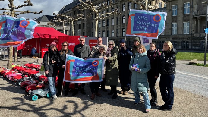 Mit Blick auf die KiBiz-Reform und die geplante Einführung von ABC-Klassen nimmt der öffentliche Druck auf die Landespolitik zu: Bei einem Aktionstag vor der Staatskanzlei in Düsseldorf warnten Träger und Fachkräfte eindringlich vor Änderungen, die zu weniger pädagogischer Zeit, größeren Gruppen und mehr Bürokratie in den Kitas führen werden.