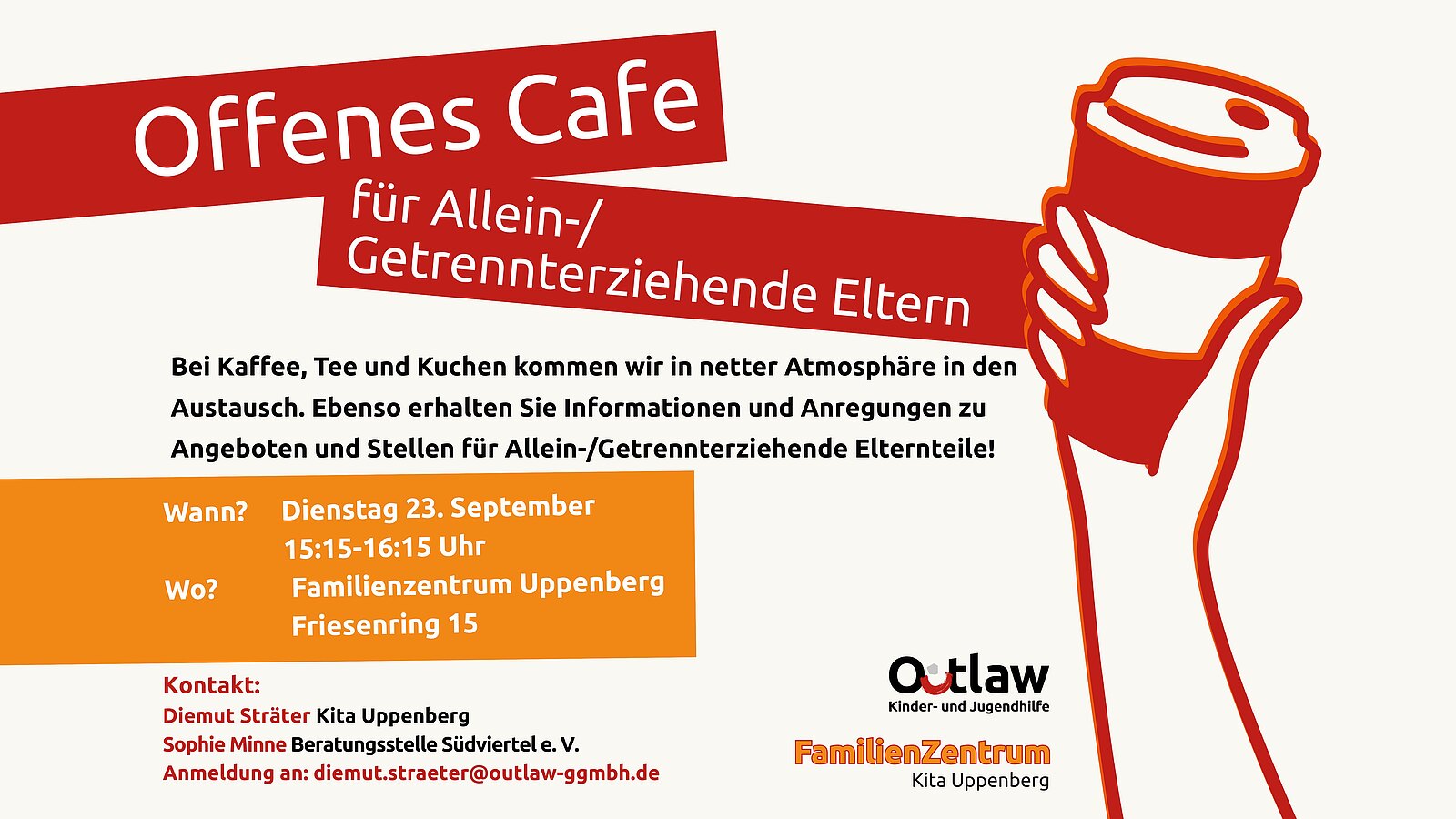 Unser offenes Café findet am Dienstag, den 23. September von 15:15 bis 16:15 Uhr im Familienzentrum / Kita Uppenberg, Friesenring 15, statt. Wer dabei sein möchte, ist herzlich eingeladen. Einfach vorbeikommen – spontan oder mit Anmeldung per E-Mail unter: diemut.straeter@outlaw-ggmbh.de.