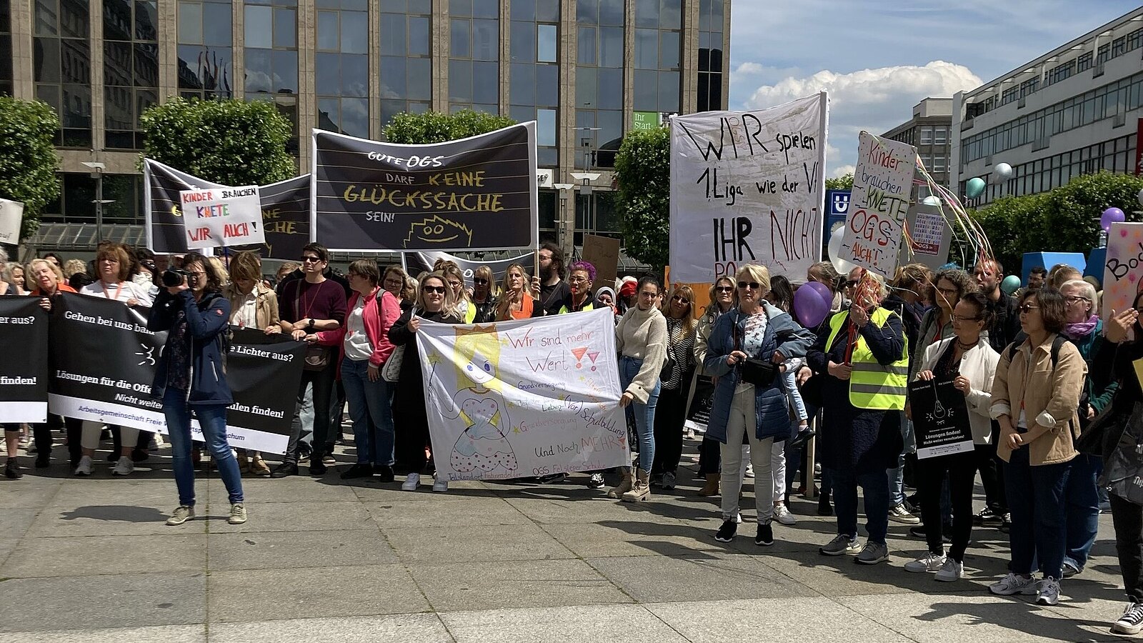 Mehr als 500 Eltern, Kinder, Mitarbeitende aus den OGS und weitere Unterstützer:innen folgten gestern unserem Aufruf zur Kundgebung vor dem Bochumer Rathaus und machten lautstark auf die schlechte finanzielle Situation der OGS aufmerksam. Aus diesem Grund fand auch keine Betreuung in unseren OGS Dahlhausen, OGS Regenbogenschule und die OGS Schule Am Volkspark statt. Gemeinsam mit den Trägern der Freien Wohlfahrtspflege und in Kooperation mit dem Schulreferat der evangelischen Kirche hatte Outlaw zur Kundgebung aufgerufen, um auf die dramatische finanzielle Lage in Bochum hinweisen. Denn die OGS stehen auf der Kippe - und damit die zuverlässige Betreuung der Kinder nach Schulschluss.