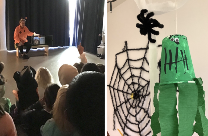 Dann ging es auch schon los mit dem Programm: Alle Kids versammelten sich und verfolgten gespannt das Kamishibai-Theater, bei dem Diemut Sträter, Fachkraft für Sprache und Sozialarbeiterin, die Geschichte „Von Otto, der kleinen Spinne“ erzählte. Um danach die Party perfekt zu starten, verkleideten sich vorab unsere Kleinen und Pädagog:innen zum Beispiel als Hexen, Geister oder Kürbisse. Nachdem alle fertig gestylt waren, konnte es endlich mit der Disco in der Turnhalle losgehen.
