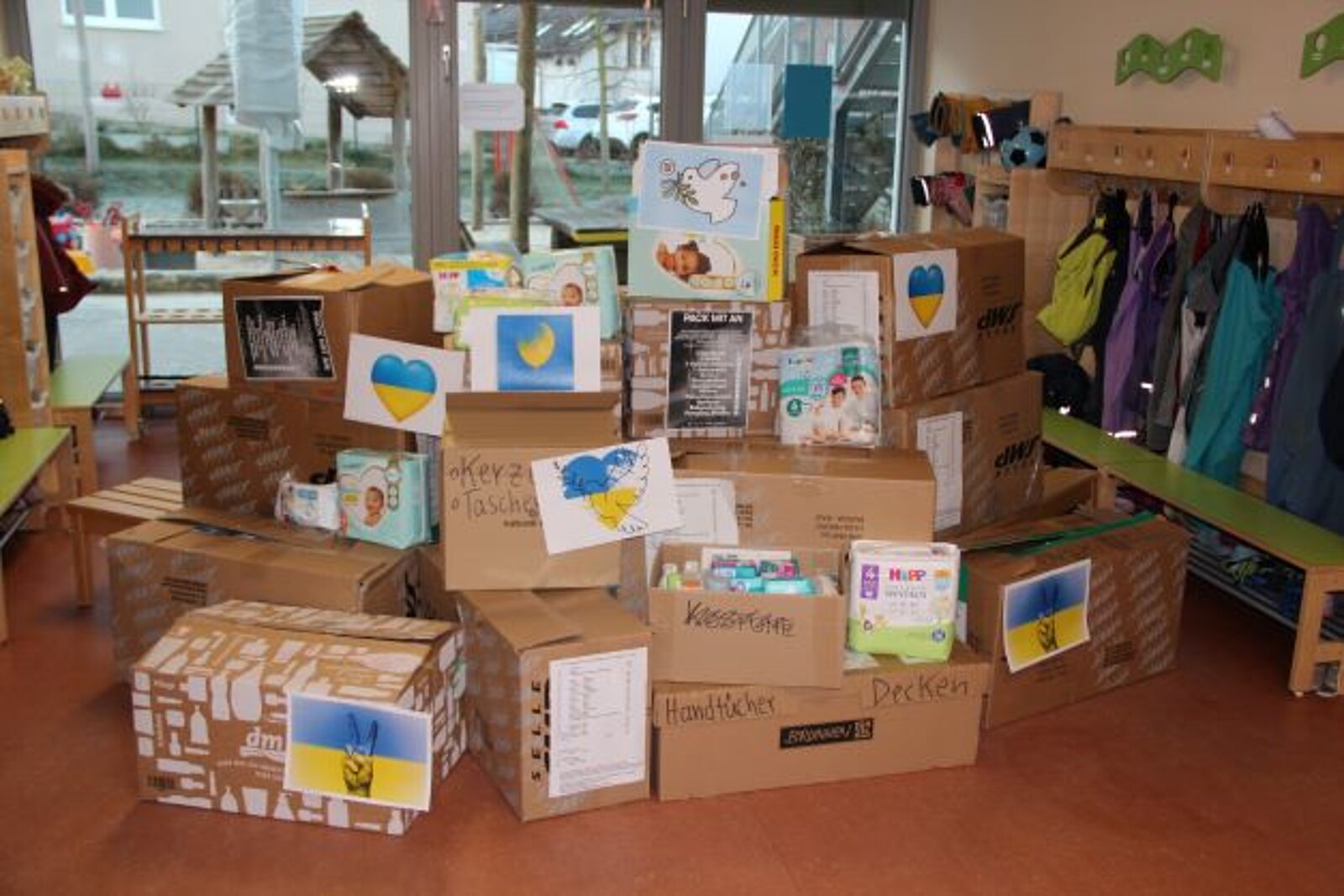 Auch in der Kita Dr.-C.-Otto-Straße in Bochum ist die Hilfsbereitschaft groß: Eltern und pädagogische Fachkräfte beteiligten sich an der Sammelaktion "Pack mit ein - Pack mit an". Über 40 Kartons mit Lebensmitteln, Windeln, Babynahrung, Hygieneartikeln, Kerzen, Taschenlampen, Decken und Handtüchern kamen so für die Partnerstadt Donezk zusammen.