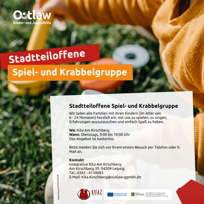 Die Krabbelgruppe findet jeden Dienstag von 9:00 bis 10:00 Uhr in der Kita Am Kirschberg, Am Kirschberg 39, in Leipzig statt. Das Angebot ist kostenlos und richtet sich an Eltern mit Kindern im Alter von 6 bis 24 Monaten.
