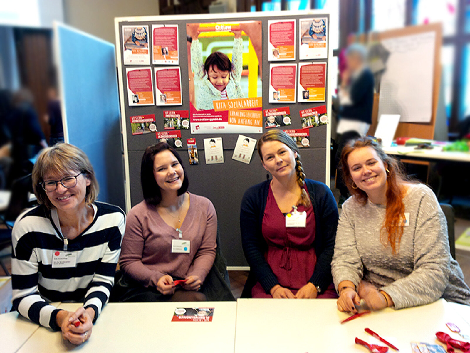 Outlaw-Kita-Sozialarbeiter*innen v.l.n.r: Antje Kruthoff-Popp (Kita Am Nettelbeckplatz), Darcey Schostak (Kita Alt-Wittenau), Elisabeth Wiener (Kita Am Maselakepark), Jasmin Warnemünde (Kita Waldshuter Zeile)