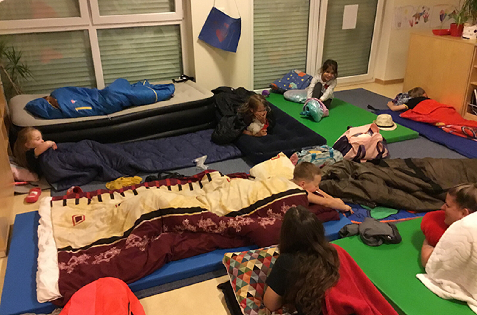 Morgens um 8:30 Uhr ging es los: Alle Maxis kamen, ausgestattet mit Schlafanzug, Schlafsack und Co. in die Kita und bauten zuerst einmal ihre Betten auf. Zum Frühstück hatten sich die Kinder ein Grillfest gewünscht:  es gab Würstchen, Grillkäse, Brötchen, Salat und auch die Limo durfte nicht fehlen – ganz schön verrückt!