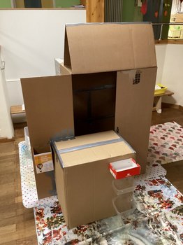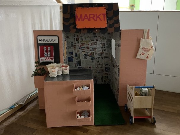 Zum Abschluss wurde der Laden liebevoll mit Lichterketten, Schildern und neuem Spielmaterial wie einer Kasse, Obst, Gemüse und anderen Lebensmitteln dekoriert. Am 4. Dezember eröffneten sie feierlich und stolz ihren Einkaufsladen, der seitdem täglich mit großer Freude bespielt wird. "Wir sind alle noch sehr beeindruckt davon, wie konzentriert und geduldig die Kinder über diesen langen Zeitraum hinweg gearbeitet haben und wie viele wertvolle Gespräche sich während des Projekts ergeben haben", zieht Alina Nessel zufrieden ein positives Fazit und verrät lächelnd: "Doch mit der Eröffnung war die Kreativität der Kinder noch mehr entfacht. Sie sagten 'Manche Lebensmittel müssen doch in den Kühlschrank!' Also entstand kurzerhand ein selbst gebauter kleiner Kühlschrank, der nun ebenfalls zum Inventar des Ladens gehört. Ich bin gespannt, ob sie noch auf weitere Ideen kommen."
