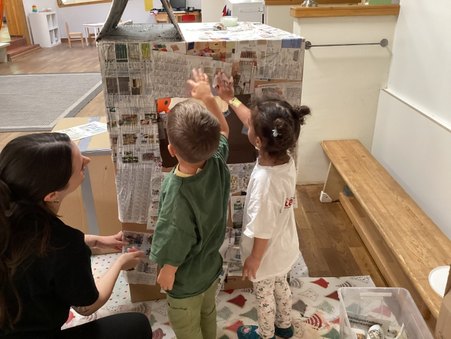 Als Grundgerüst für den Laden diente ein großer Karton. "Wie auch schon in der Vergangenheit hat uns Heiko, der Lebenspartner einer Kollegin, wieder großzügig mit stabilen Kartons versorgt", erzählt Alina Nessel. Für eine Langlebigkeit des Kaufladens planten die Erzieher:innen die Konstruktion, bevor es mit den Kindern an die Umsetzung des Hausbaus ging. Zuerst rissen die Drei- bis Sechsjährigen zahlreiche Zeitungen in kleine Stücke und verklebten das gesamte Haus mit Kleister. Diese Schicht verleiht dem Bau eine zusätzliche Stabilität und sollte eine gut bemalbare Oberfläche schaffen. Im Prozess stellten sie fest, dass sich die beschichtete Zeitung nicht optimal für das spätere Anmalen eignete. Die Kinder hatten daraufhin die wunderbare Idee: "Dann tapezieren wir das Haus – wie ein richtiges Haus!" Gesagt, getan! Mit viel Kleister und Tapete entstand eine glatte und feste Oberfläche. Dann mussten sich die Kinder erst einmal in Geduld üben, bis alles für die weitere Gestaltung trocknete. Einheitlich entschieden sie sich für die Wandfarbe Grau. Mit Kreppband klebten die Erzieher:innen und Kinder ein Steinmuster auf und tupften die Farbe mit Schwämmen sorgfältig drüber. Als das Kreppband abgezogen wurde, staunten die Kinder: "Wow, das sieht aus wie eine echte Mauer! Das Dach fehlt noch!" Und so machten sie sich direkt an die Arbeit und zeichneten die Dachziegel auf einer Pappe mit einer Schablone vor, schnitten sie aus und klebten sie Stück für Stück auf das Dach.