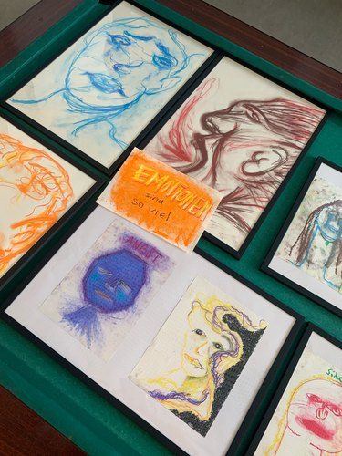 Im Mittelpunkt der Ausstellung stand das Thema Emotionen. Von Freude über Angst, Wut, Liebe, Einsamkeit bis hin zu Hoffnung machten die Arbeiten individuelle Gefühlswelten sichtbar. Mithilfe unterschiedlicher Techniken wie Fotografie, Linoldruck, Collagen, Pastellkreide, Acrylfarben, Graffiti oder musikalischer Elemente entstanden Werke, die Stimmungen transportierten und nonverbale Ausdrucksformen eröffneten. Ziel war es, Emotionen nicht nur zu benennen, sondern sie so darzustellen, dass Betrachter:innen die jeweilige Stimmung nachempfinden können.