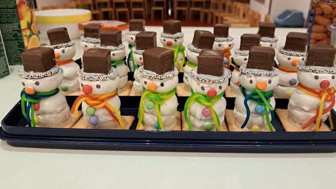 Danach sangen alle gemeinsam Winter- und Weihnachtslieder, um sich auf die unmittelbar bevorstehende Weihnachtszeit einzustimmen. "Sicherlich haben wir so toll und laut gesungen, dass sich auch die Bewohner:innen und Mitarbeiter:innen der Paul-Riebeck-Stiftung daran erfreuen konnten", hofft Stefanie Haase vom Leitungsteam. Und nachdem alle so viel gesungen hatten, gab es eine Stärkung. "Und das war wirklich lecker und vielffältig mit Obstspießen, Lebkuchen und Schneemännern - und wir danken den Eltern sehr für die tolle Vorbereitung", so Stefanie Haase.
