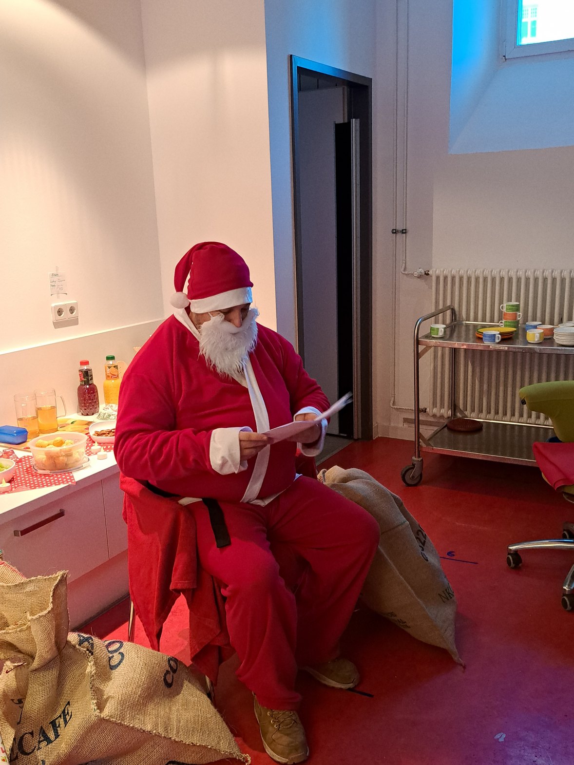 Doch plötzlich wurden die Kinder ganz aufgeregt, denn sie meinten, es hätte jemand an der Tür geklopft. Wer könnte das denn sein? Und tatsächlich: Der Weihnachtsmann kam zu Besuch und die Kinder trugen ihm freudig noch ein paar Lieder und Gedichte vor. Das lohnte sich, denn der Weihnachtsmann hatte drei große Säcke voller Geschenke mitgebracht, die er an die Kinder verteilte.