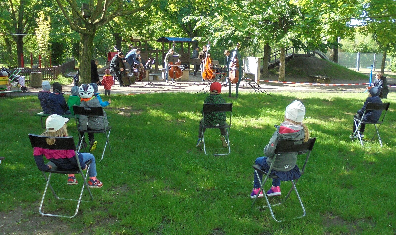 Das war ein tolles musikalisches Erlebnis und eine wunderschöne Abwechslung für die Kinder in der Notbetreuung der Outlaw-Kita Am Kirschberg: Im Garten der Grünauer-Einrichtung gaben fünf Musiker*innen des Leipziger Gewandhausorchesters am 12. Mai 2020 ein Streichkonzert.