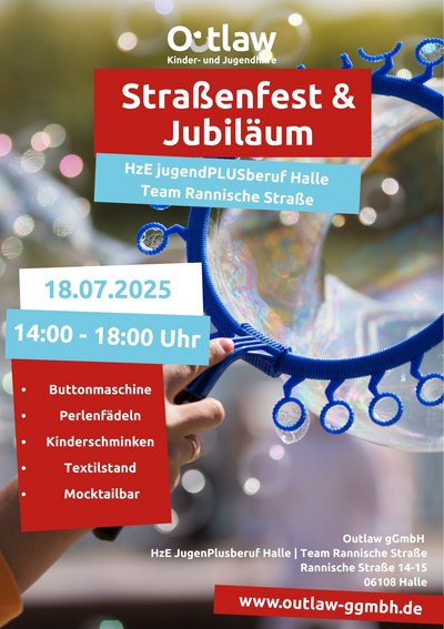 Das Team der HzE JugendPLUSberuf Halle in der Rannischen Straße, lädt herzlich zum großen Straßenfest und Jubiläum am Freitag, den 18. Juli 2025, von 14:00 bis 18:00 Uhr ein!